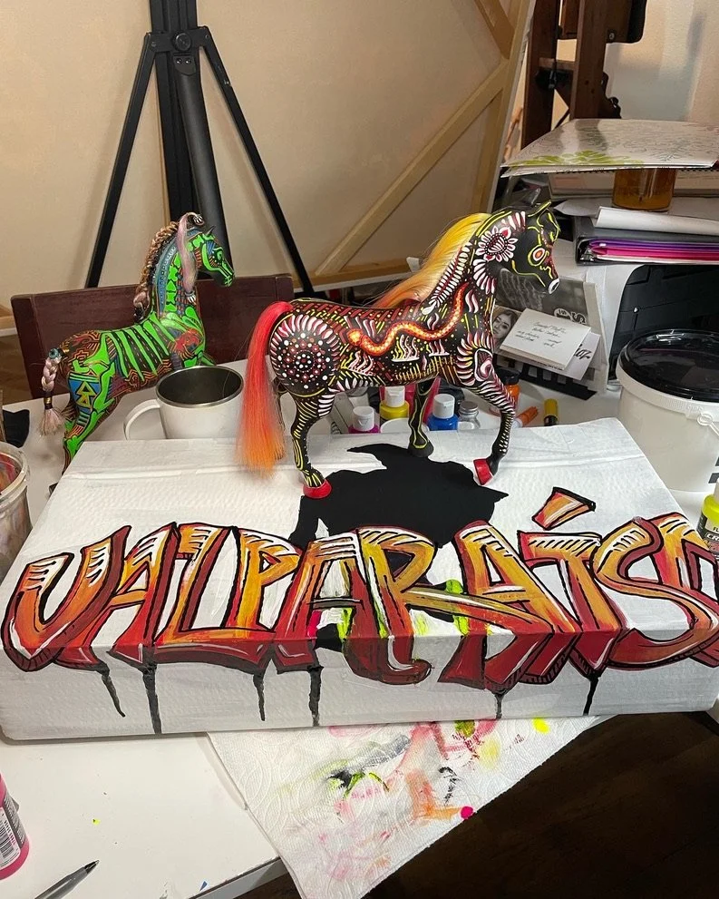 Recycled Toy, Water-based Acrylic Paints (liquitex, paint pens, Apple Craft) , hair dyed with airbrush paint mixed in water