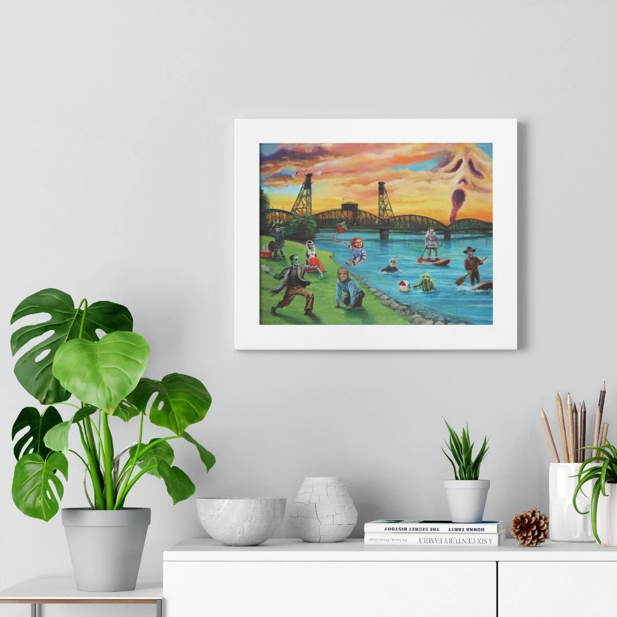 The fun and quirky depiction of the Hawthorne bridge and Portland, OR Waterfront with movie monsters. It features Mike Meyers, Freddie Kruger, Swamp Thing, Chucky, Frankenstein’s Monster, Frankenstein’s Bride, Pennywise, and Wolfman all doing classic PNW outdoor activities like paddle boarding, swimming, BBQing, and playing frisbee. This unique design is sure to add a touch of personality to your home or workspace.