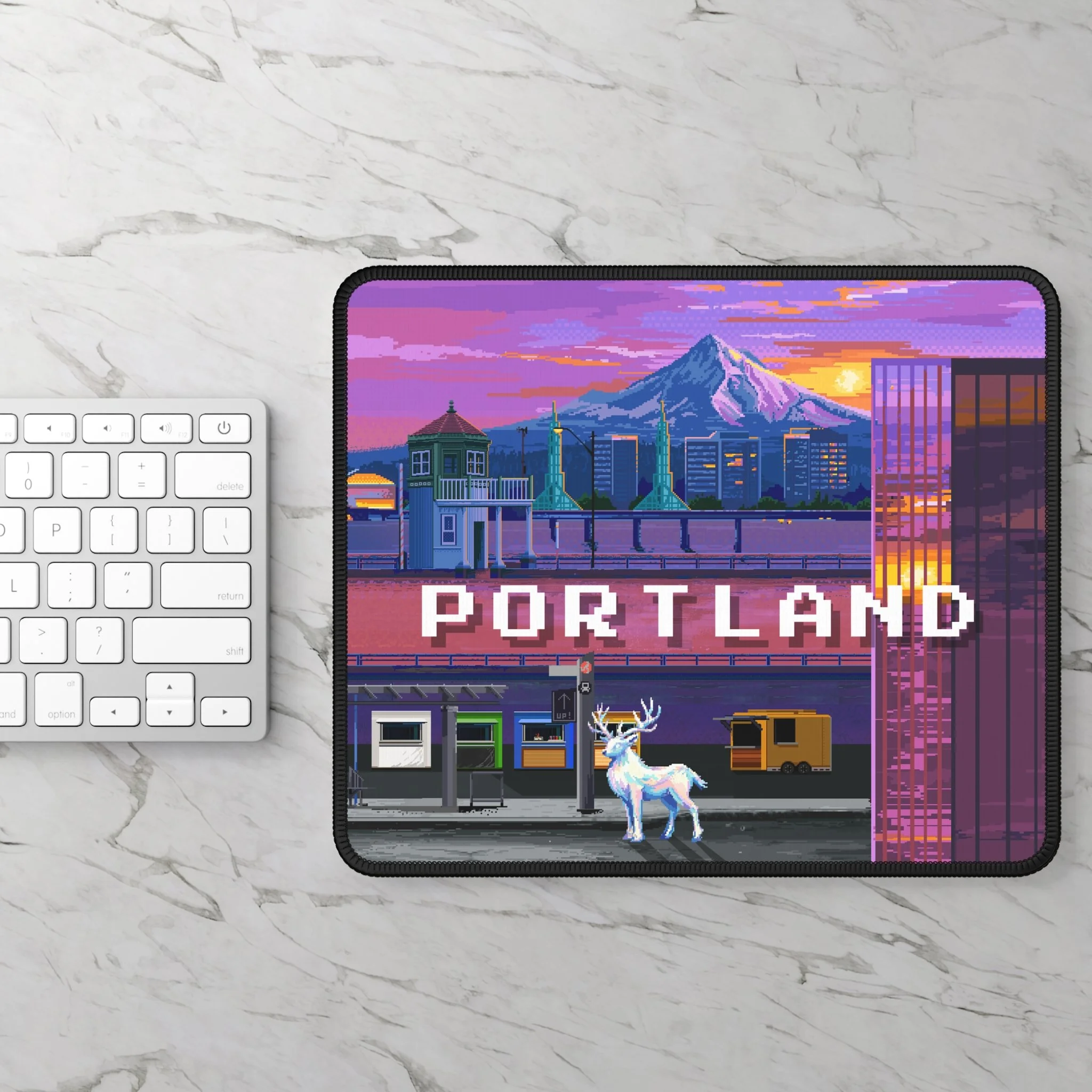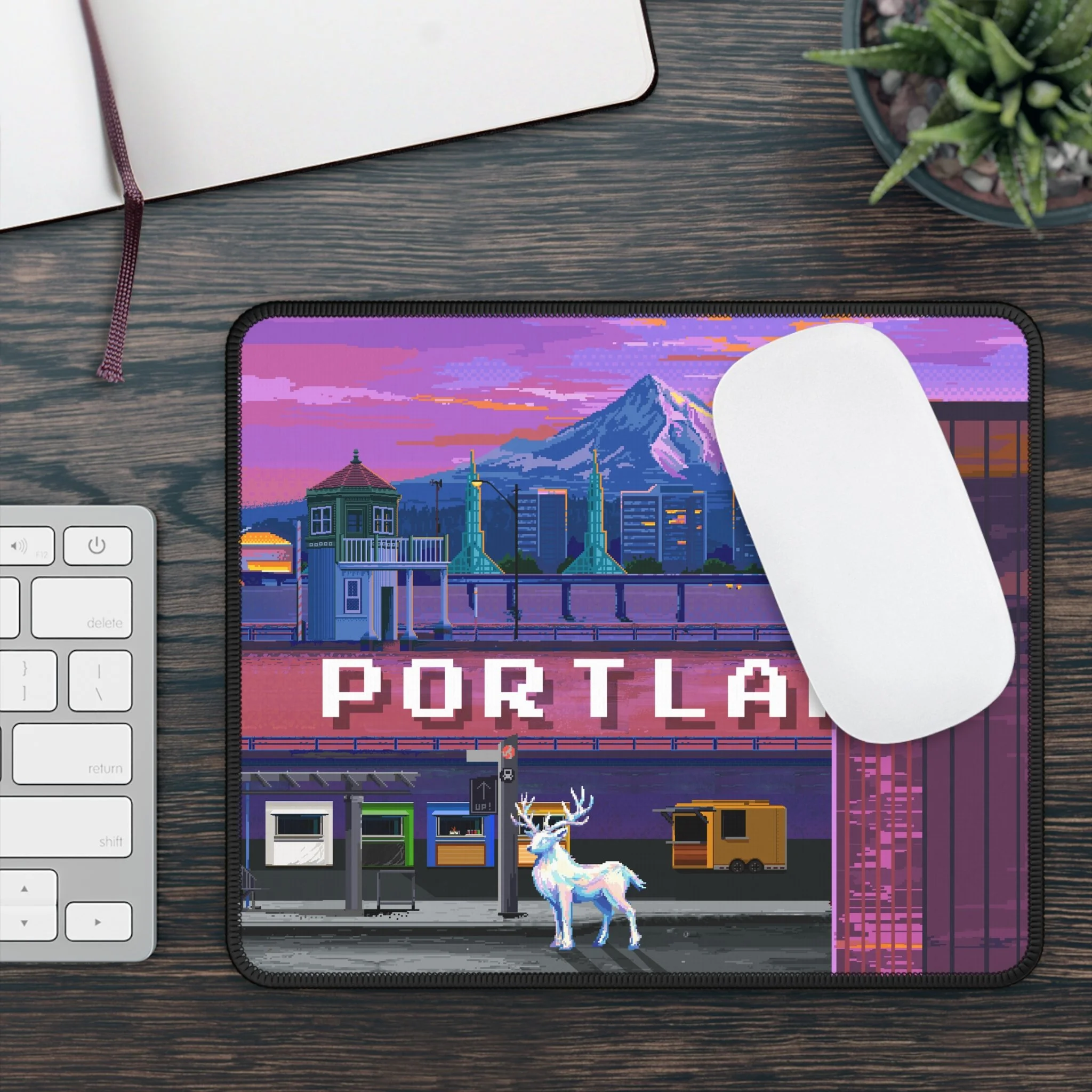 A compact, artful mouse pad that brings a pixel-art Portland sunset to your desk. The scene layers neon rooftops, the city skyline, Burnside Bridge, food carts, and a celestial white stag beneath Mount Hood. These are game assets drawn for the Rose City Rising game, illustrated on glide-ready surface. Bring to your workspace a nostalgic, retro-gaming vibe. Light to clean and slim enough for small setups, it slips easily into daily routines for gamers, creators, and city lovers who want a touch of local color at their fingertips.