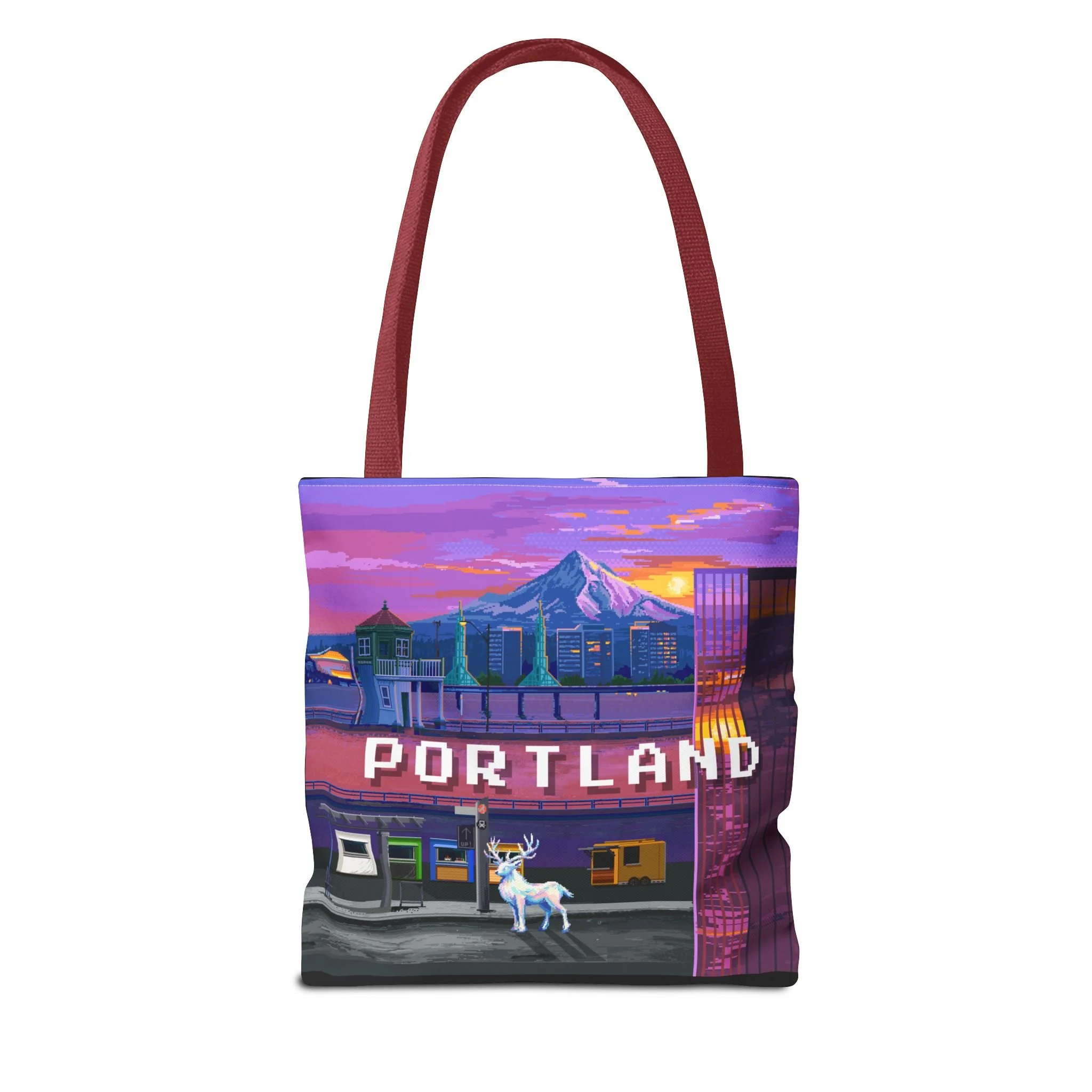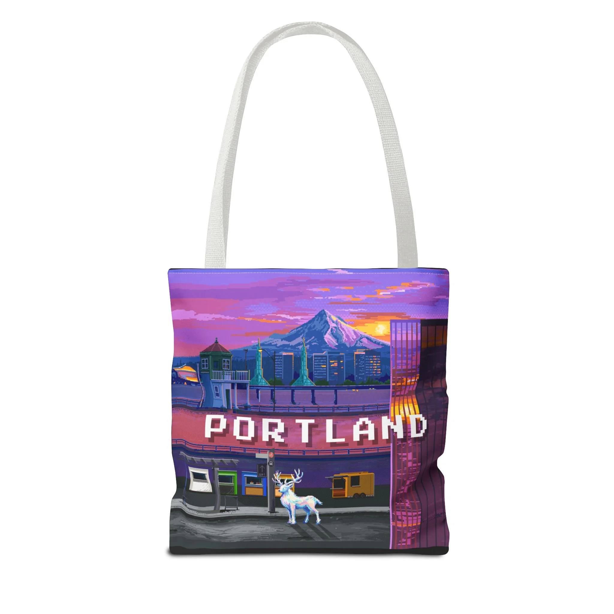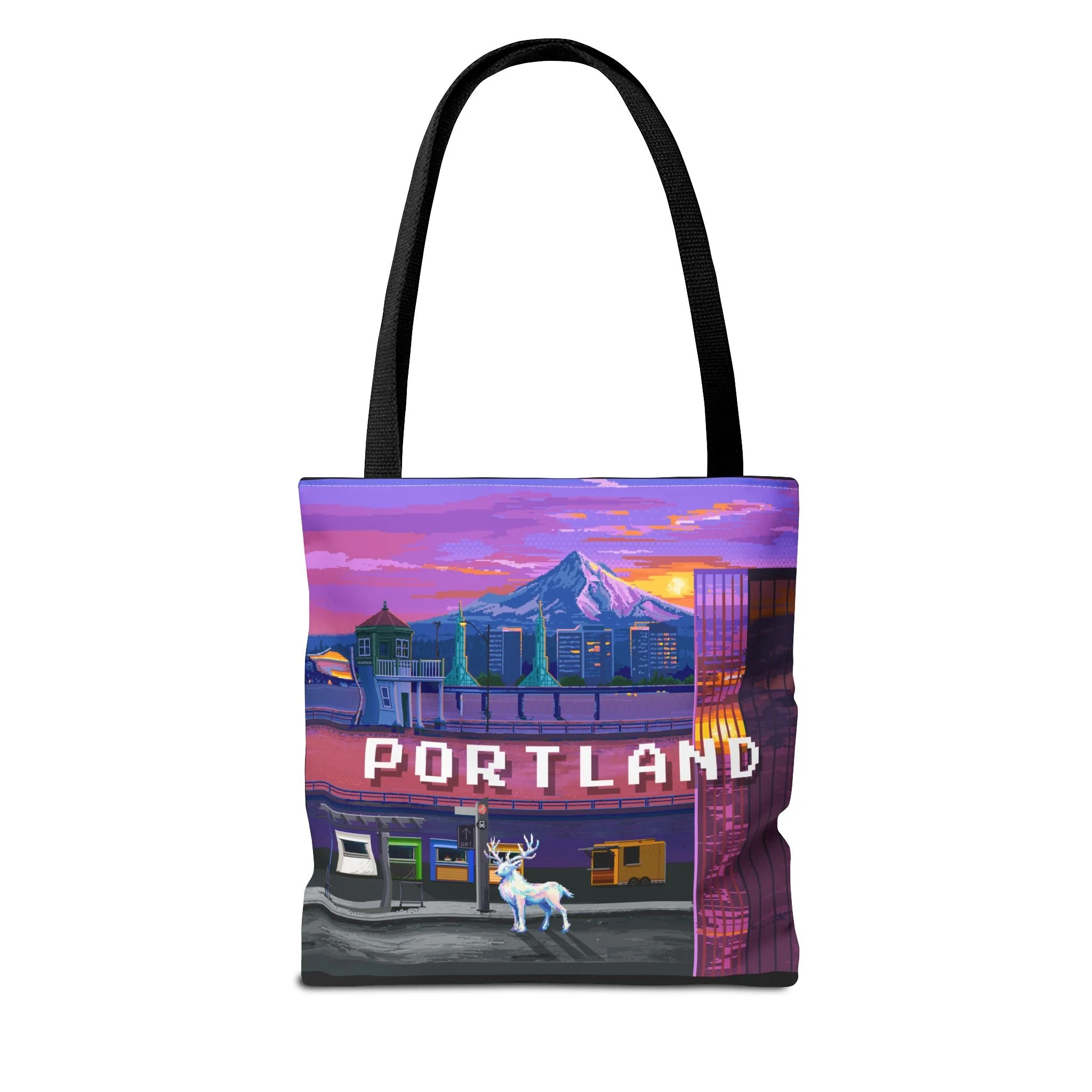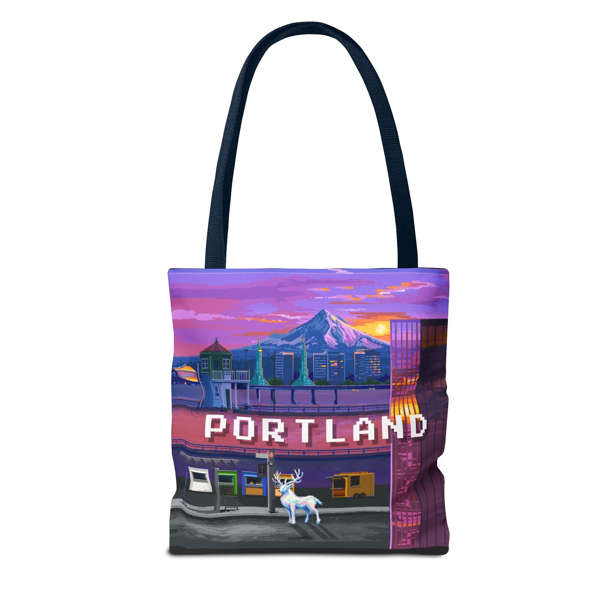 This colorful, all-over-print tote brings a slice of Portland with you everywhere. A sunset-drenched skyline and Mount Hood sit above a retro text reading "PORTLAND". A celestial white stag strolls the street. Burnside, food carts, transit stop, and big pink are all in the scene. Part of the Rose City Rising game. The durable polyester body keeps the print vibrant wash after wash, boxy corners give extra room for groceries or sketchbooks, and reinforced handles take the weight of your day. Carry it to market, to class, or on a city stroll; it feels like a postcard and a practical companion rolled into one.