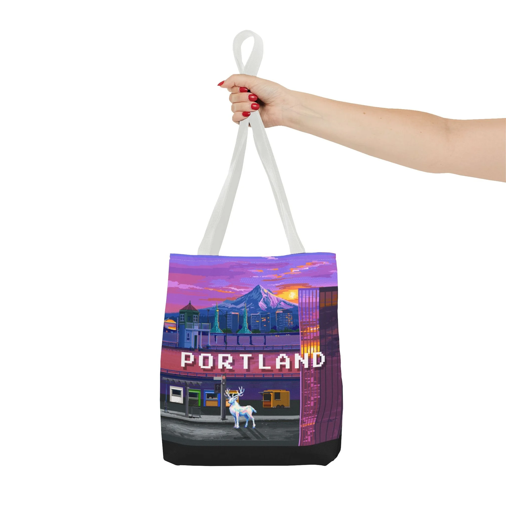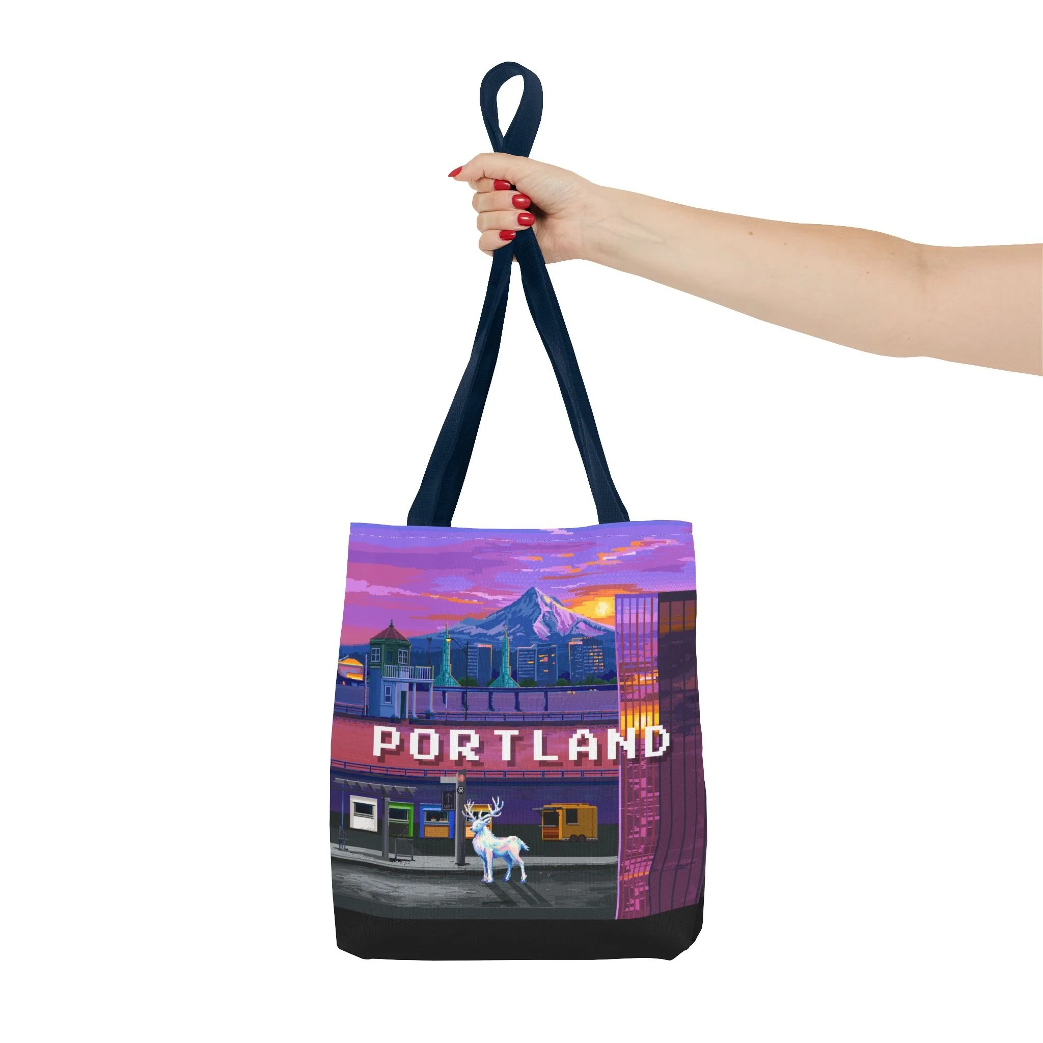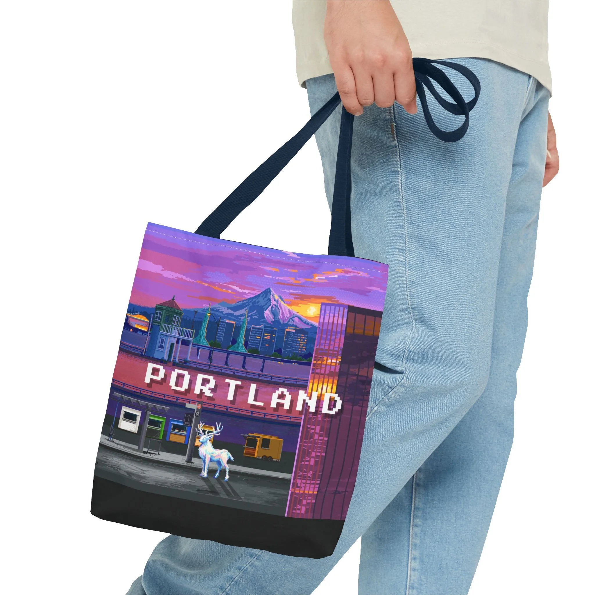 This colorful, all-over-print tote brings a slice of Portland with you everywhere. A sunset-drenched skyline and Mount Hood sit above a retro text reading "PORTLAND". A celestial white stag strolls the street. Burnside, food carts, transit stop, and big pink are all in the scene. Part of the Rose City Rising game. The durable polyester body keeps the print vibrant wash after wash, boxy corners give extra room for groceries or sketchbooks, and reinforced handles take the weight of your day. Carry it to market, to class, or on a city stroll; it feels like a postcard and a practical companion rolled into one.