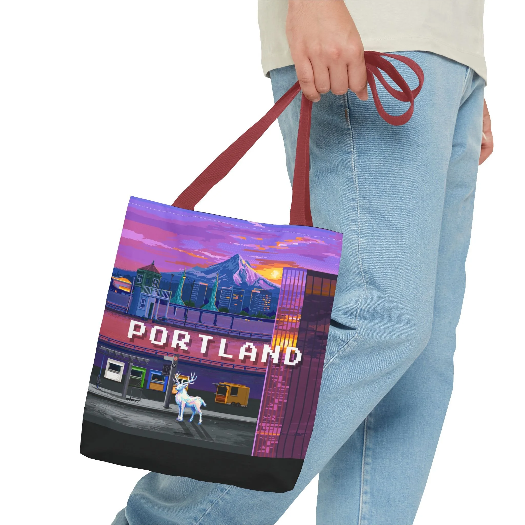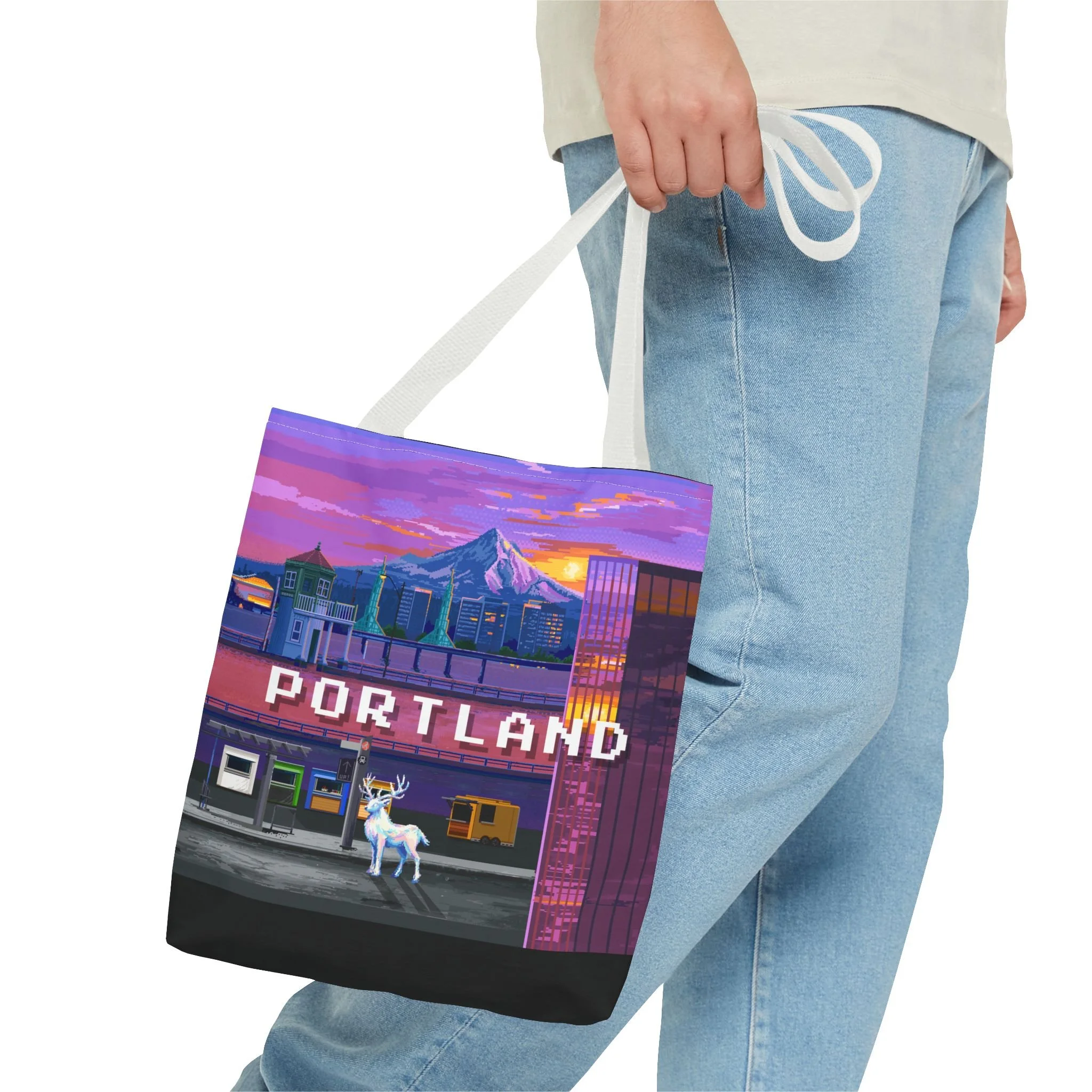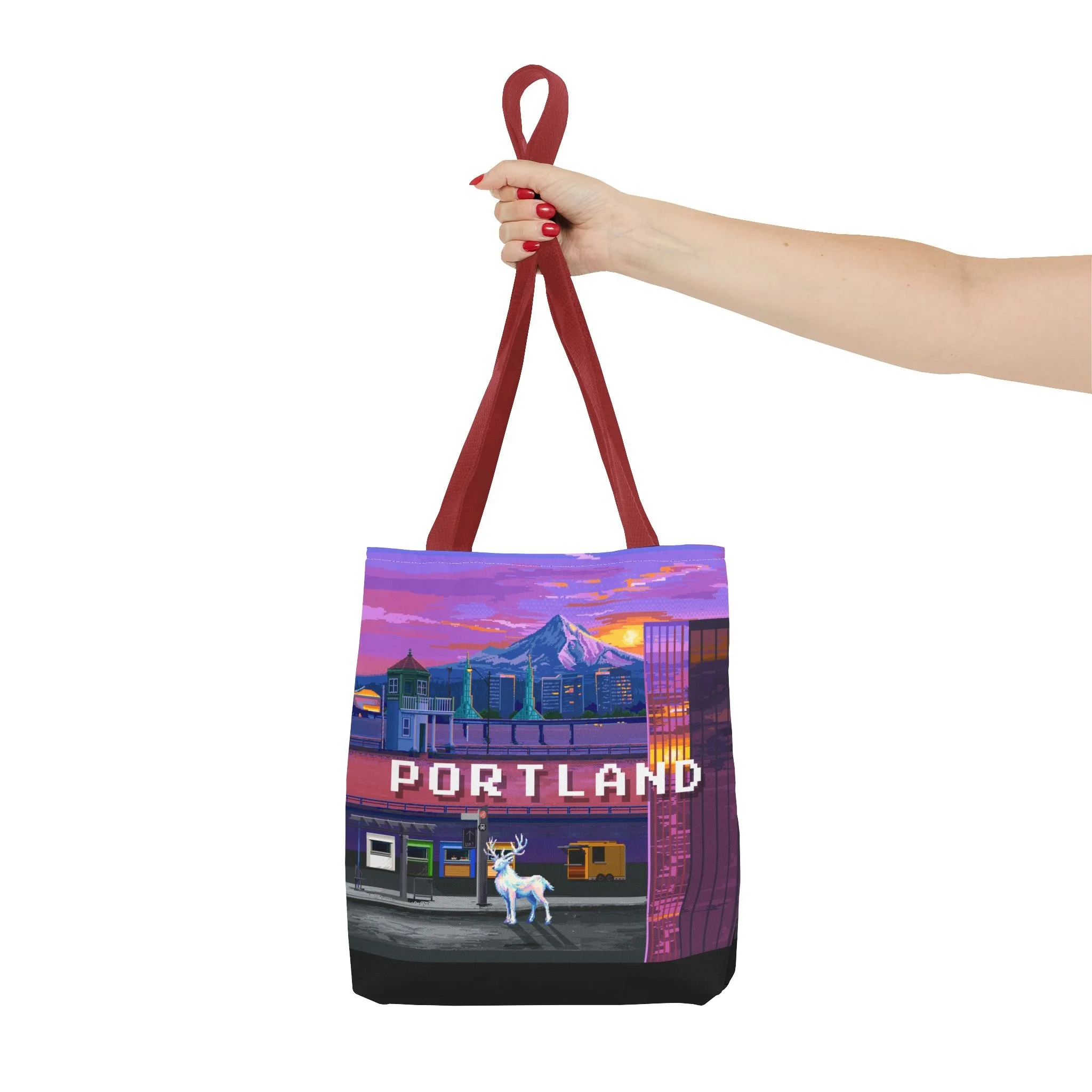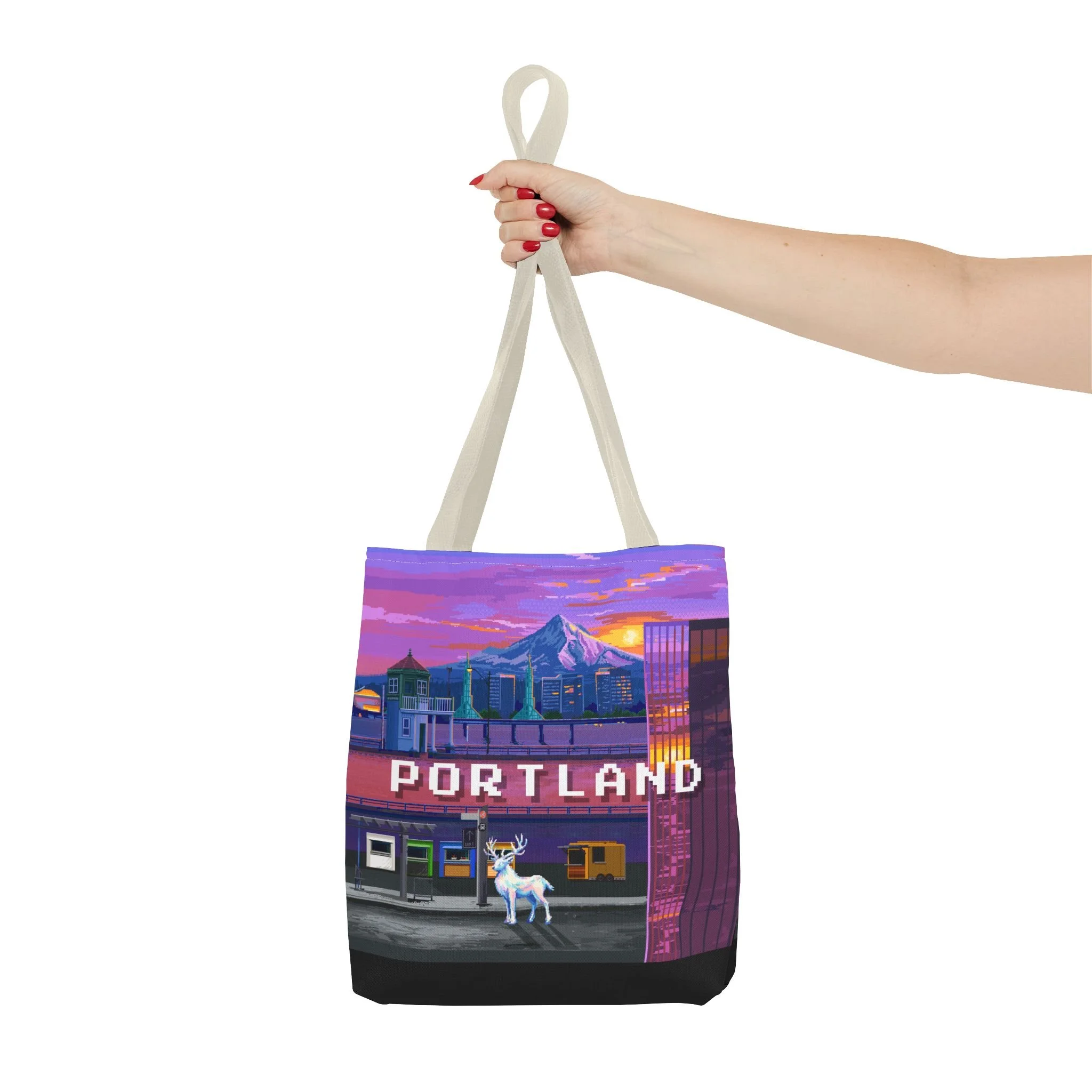 This colorful, all-over-print tote brings a slice of Portland with you everywhere. A sunset-drenched skyline and Mount Hood sit above a retro text reading "PORTLAND". A celestial white stag strolls the street. Burnside, food carts, transit stop, and big pink are all in the scene. Part of the Rose City Rising game. The durable polyester body keeps the print vibrant wash after wash, boxy corners give extra room for groceries or sketchbooks, and reinforced handles take the weight of your day. Carry it to market, to class, or on a city stroll; it feels like a postcard and a practical companion rolled into one.